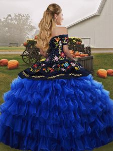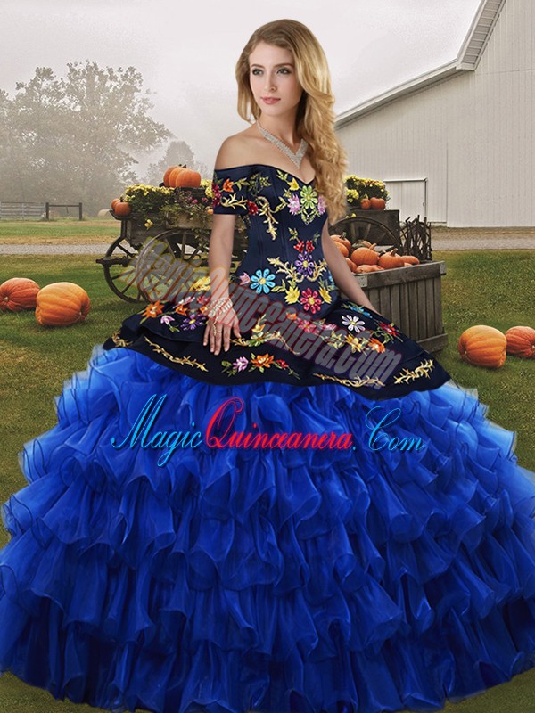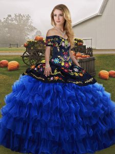 Deluxe Organza Off The Shoulder Sleeveless Lace Up Embroidery and Ruffled Layers Sweet 16 Dresses in Blue And Black