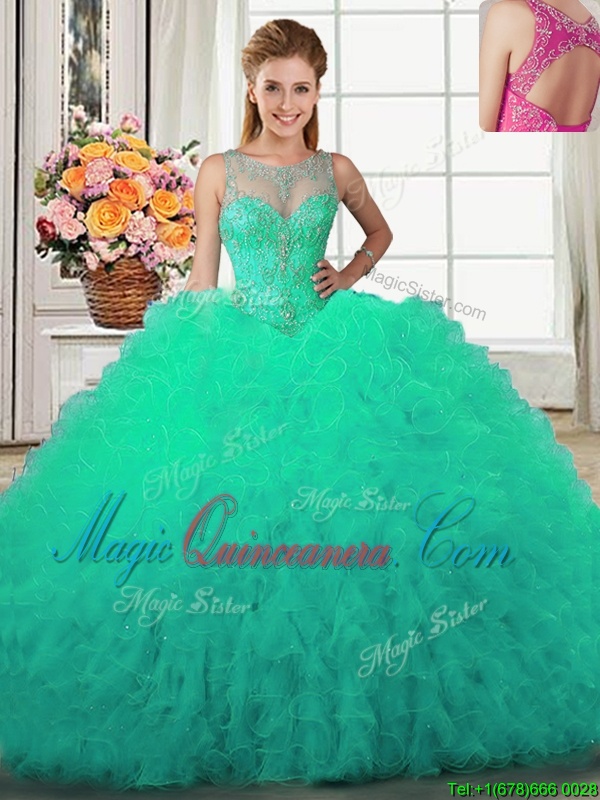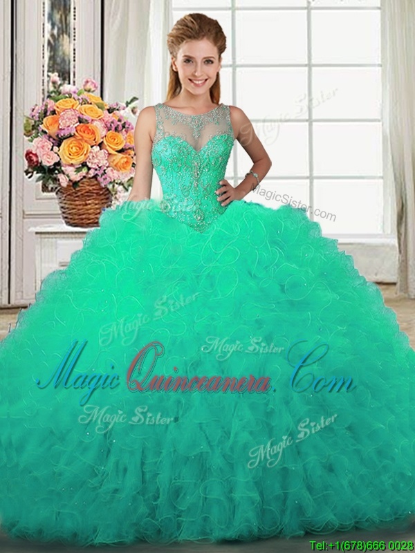 Deluxe Scoop Beading and Ruffles Sweet 16 Dresses Turquoise Lace Up Sleeveless Floor Length