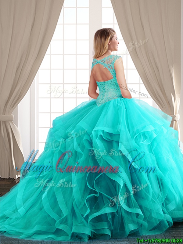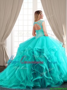 Deluxe Scoop Cap Sleeves Tulle 15 Quinceanera Dress Beading and Appliques and Ruffles Brush Train Lace Up