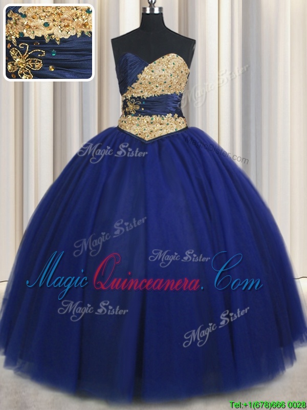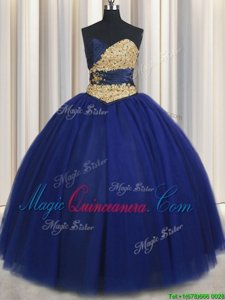 , Deluxe Sweetheart Sleeveless Lace Up 15 Quinceanera Dress Navy Blue Tulle