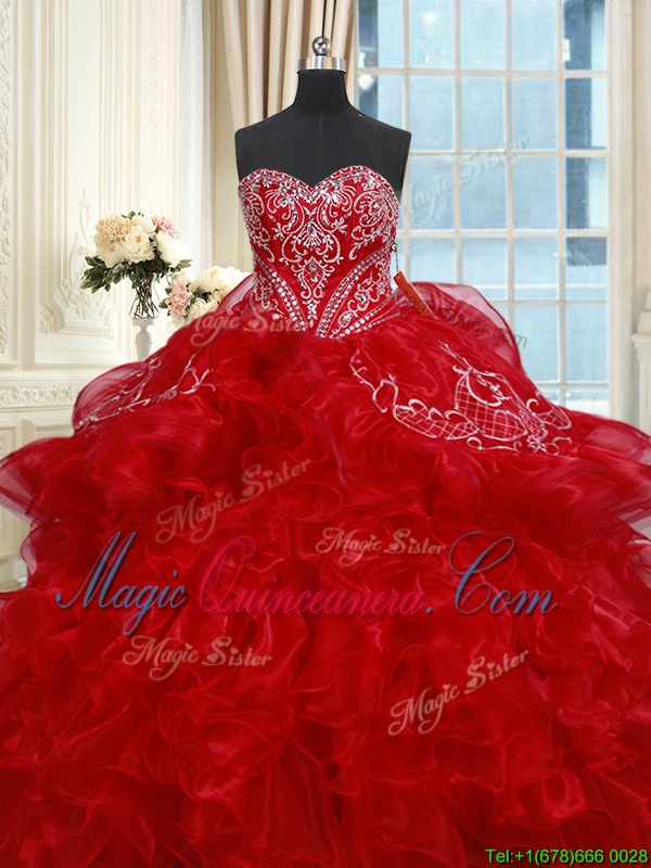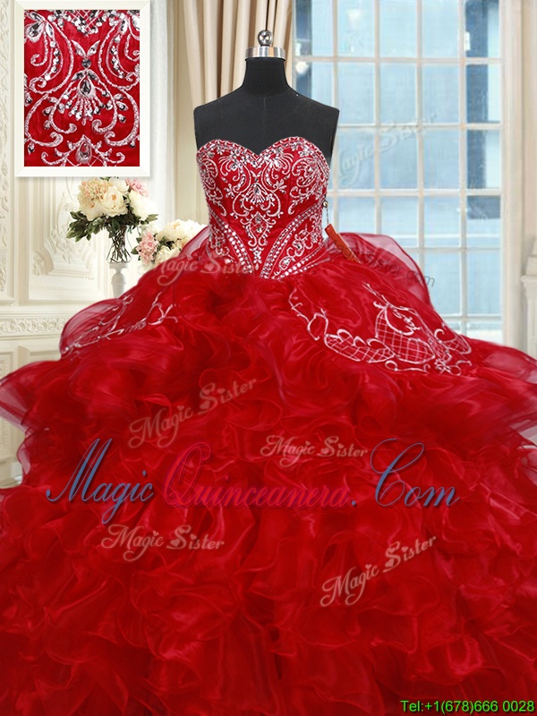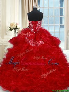Designer Floor Length Lace Up 15 Quinceanera Dress Red and In for Military Ball and Sweet 16 and Quinceanera with Beading and Ruffles
