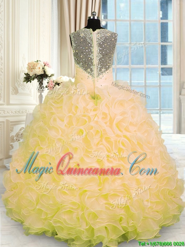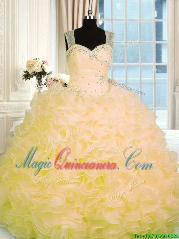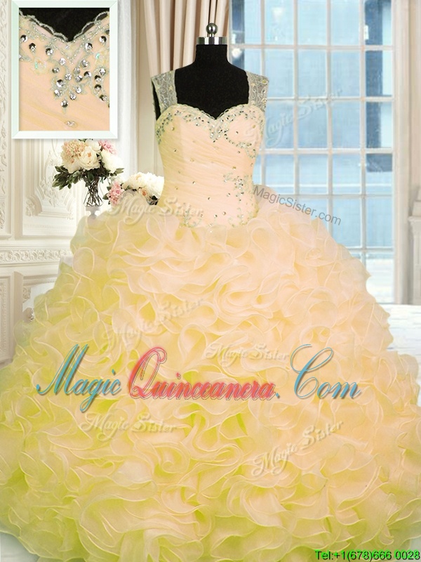 Designer Gold Ball Gowns Organza Sweetheart Sleeveless Beading and Ruffles Floor Length Zipper Quinceanera Dresses