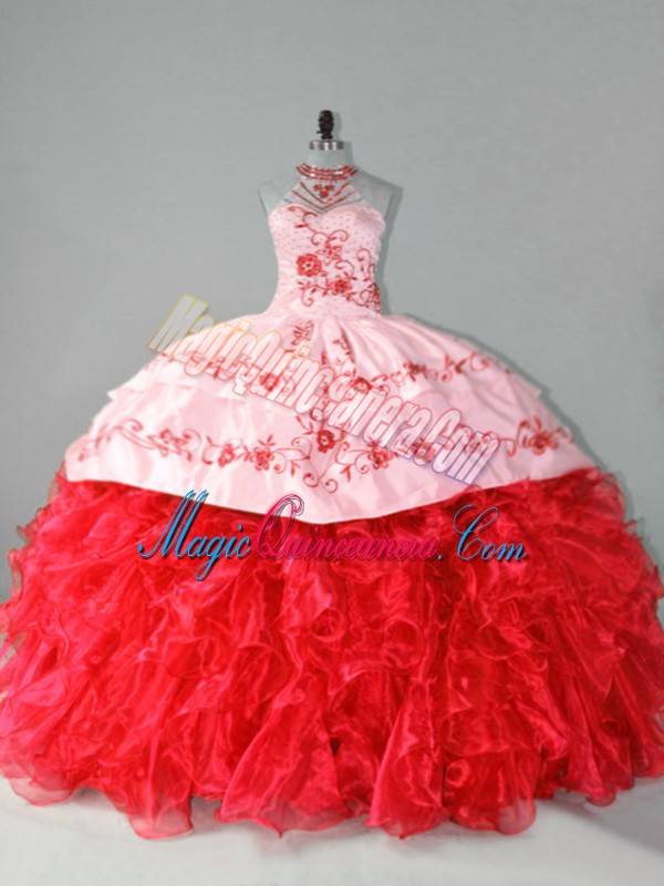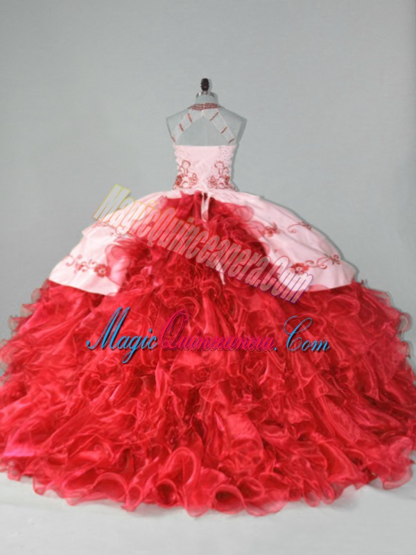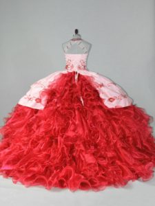 Designer Red 15th Birthday Dress Organza Court Train Sleeveless Embroidery and Ruffles