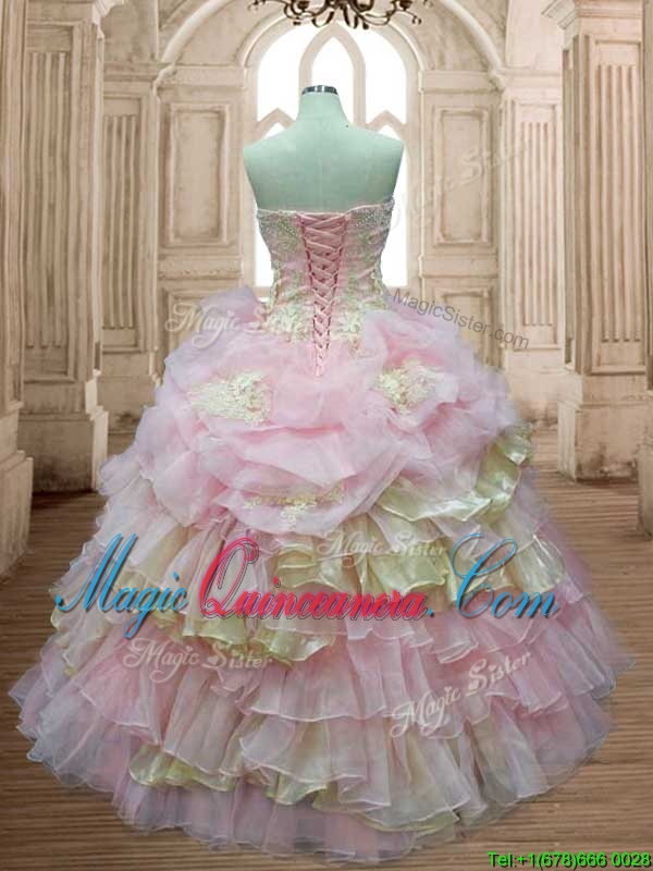 , Discount Applique and Ruffled Layers Quinceanera Dress in Baby Pink and Yellow