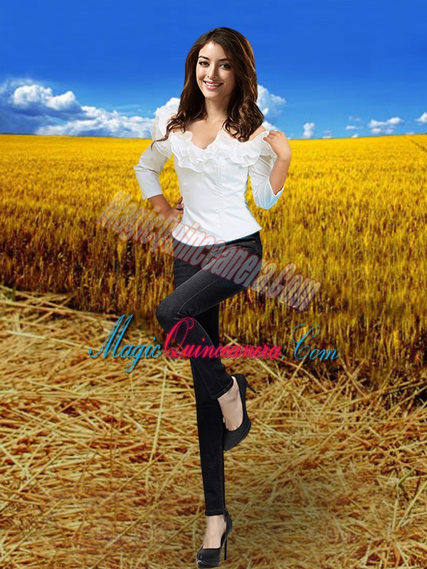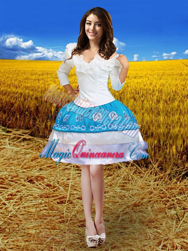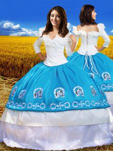 Discount Blue And White Taffeta Lace Up Off The Shoulder 3 4 Length Sleeve Floor Length Sweet 16 Dresses Embroidery and Ruffles