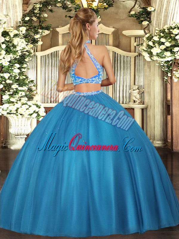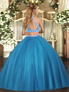 , Discount Floor Length Aqua Blue Quinceanera Gown Halter Top Sleeveless Criss Cross