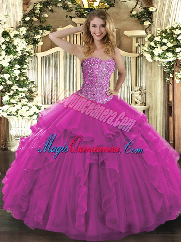 Discount Fuchsia Sleeveless Floor Length Beading and Ruffles Lace Up Quinceanera Gown - Magic Quinceanera