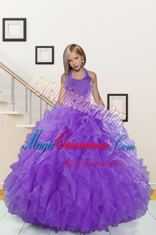 , Discount Halter Top Sleeveless Beading and Ruffles Lace Up Pageant Dress for Girls