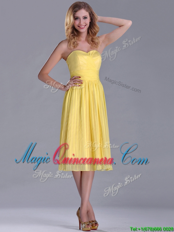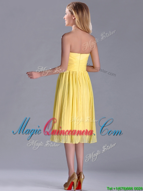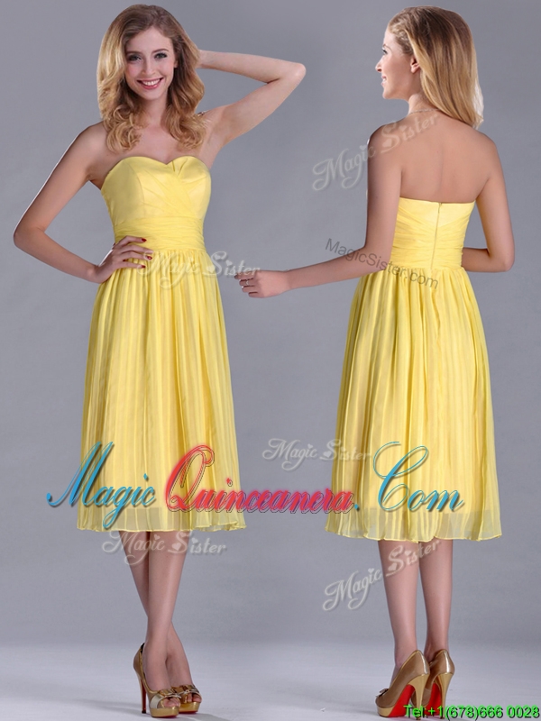 Discount Pleated Yellow Chiffon Prom Dress in Tea Length