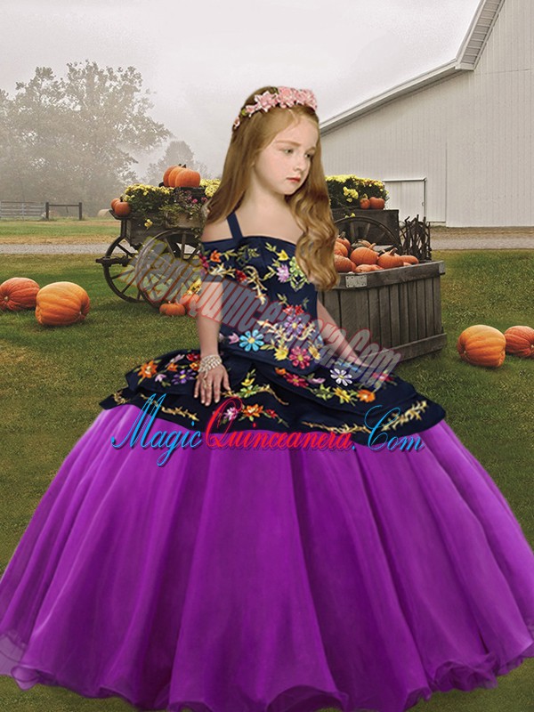 Discount Purple Ball Gowns Organza Straps Sleeveless Embroidery Floor Length Lace Up Girls Pageant Dresses