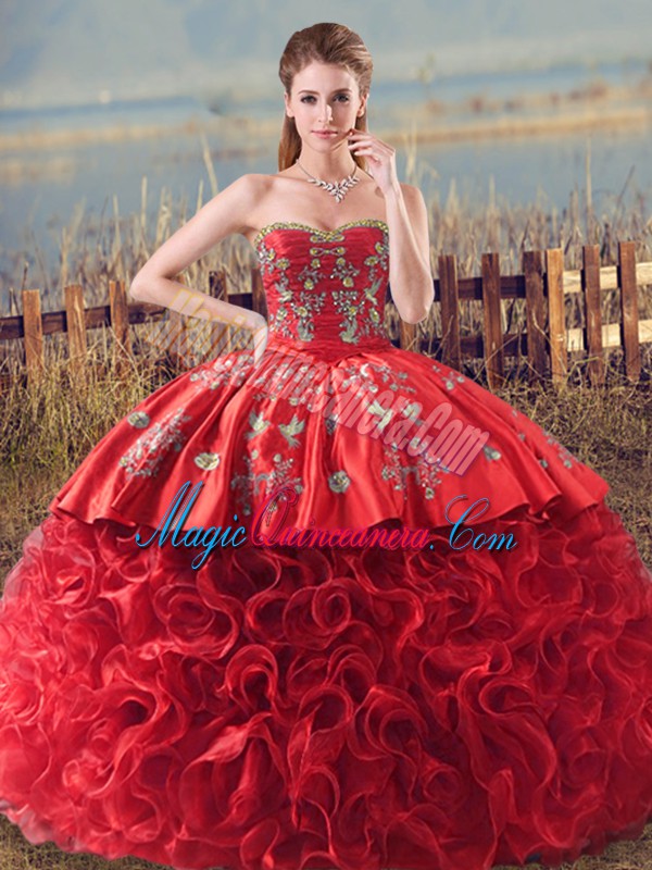 Discount Sweetheart Sleeveless 15th Birthday Dress Brush Train Embroidery and Ruffles Coral Red Fabric With Rolling Flowers