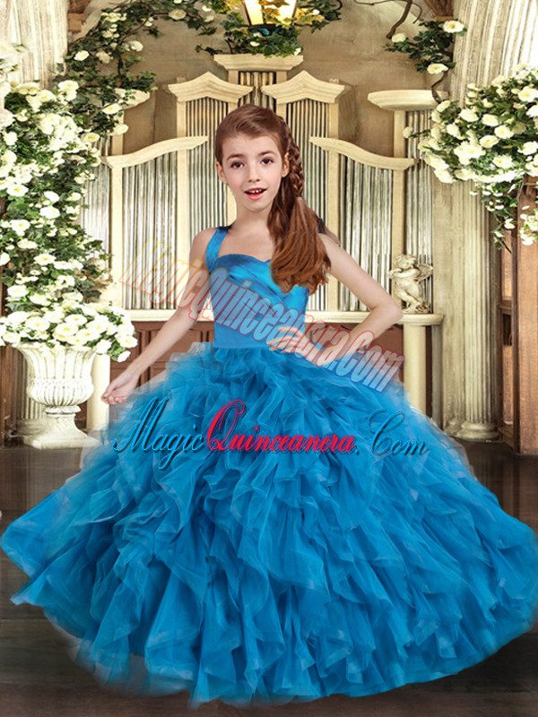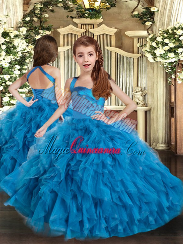 Dramatic Floor Length Ball Gowns Sleeveless Blue Pageant Dress Womens Lace Up