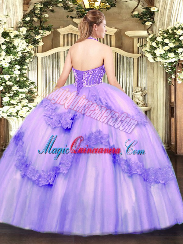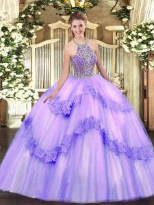 Dramatic Floor Length Lace Up Quinceanera Dresses Lavender for Military Ball and Sweet 16 and Quinceanera with Beading and Appliques