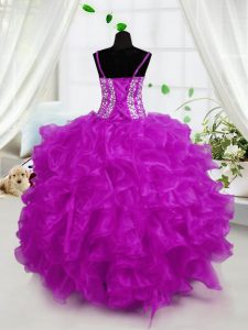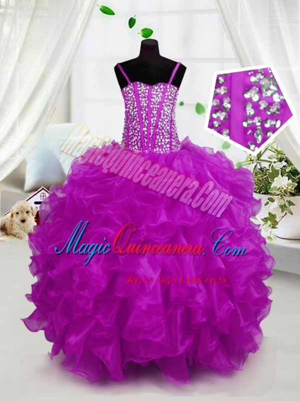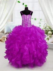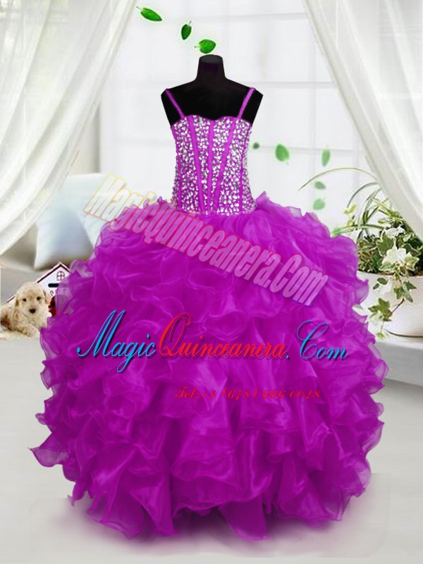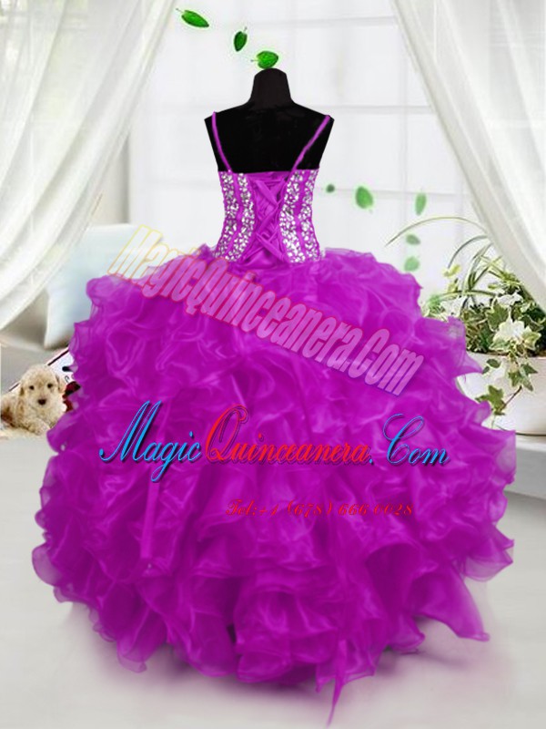 Dramatic Hot Pink Spaghetti Straps Lace Up Beading and Ruffles Pageant Dress Sleeveless