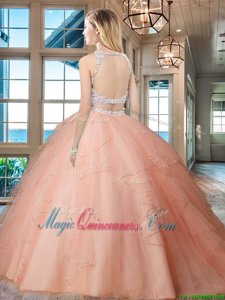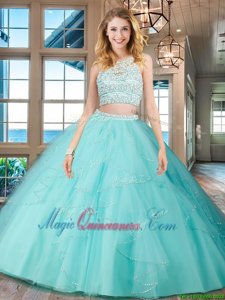 Dramatic Scoop Floor Length Two Pieces Sleeveless Aqua Blue Quinceanera Dress Backless