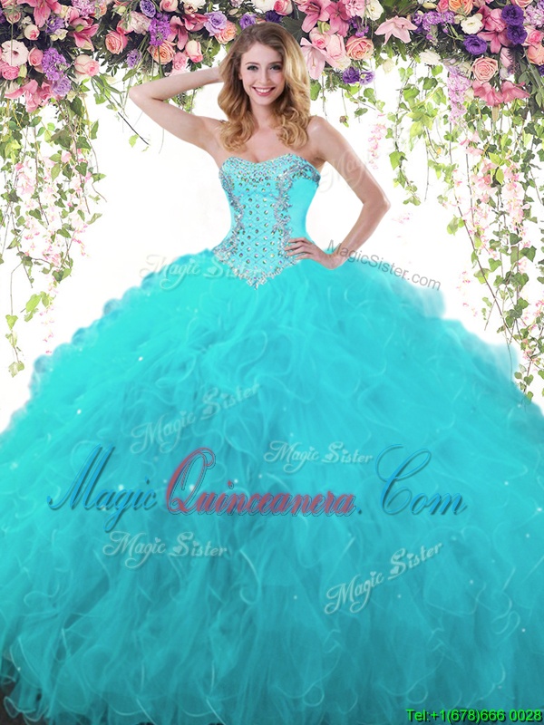 Dramatic Teal Lace Up 15 Quinceanera Dress Beading and Ruffles Sleeveless Floor Length