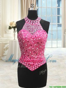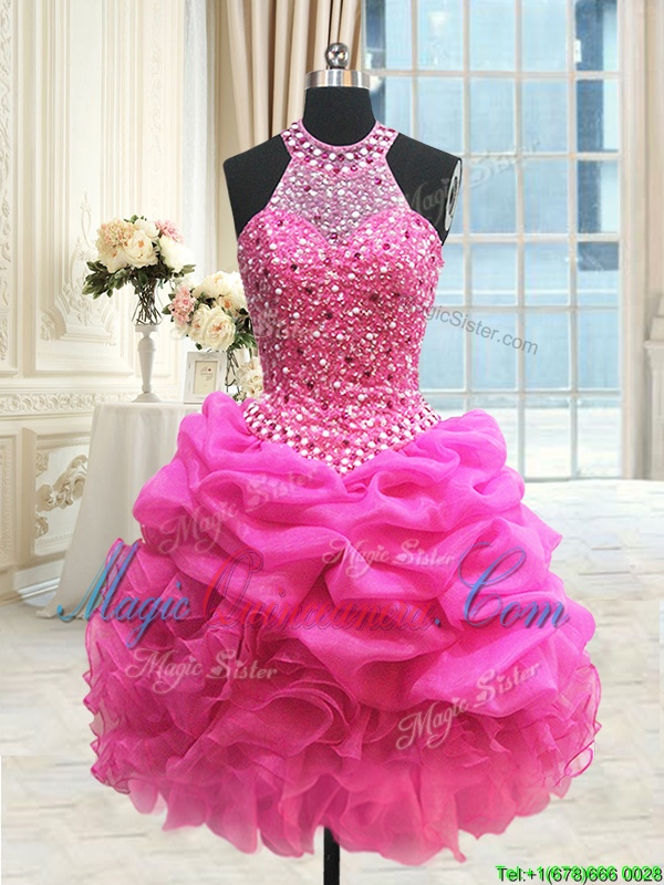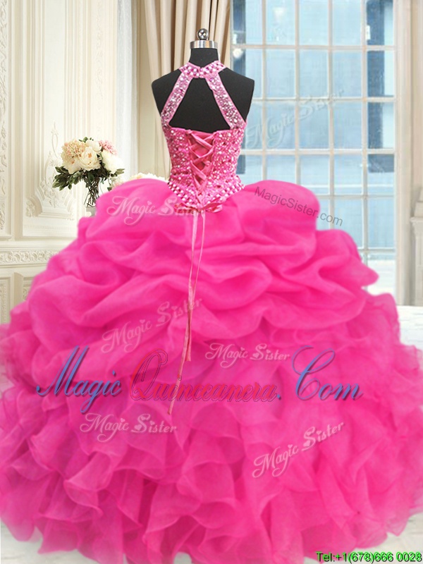 Dramatic Three Piece Hot Pink Lace Up Halter Top Beading and Ruffles and Pick Ups Sweet 16 Dress Organza Sleeveless