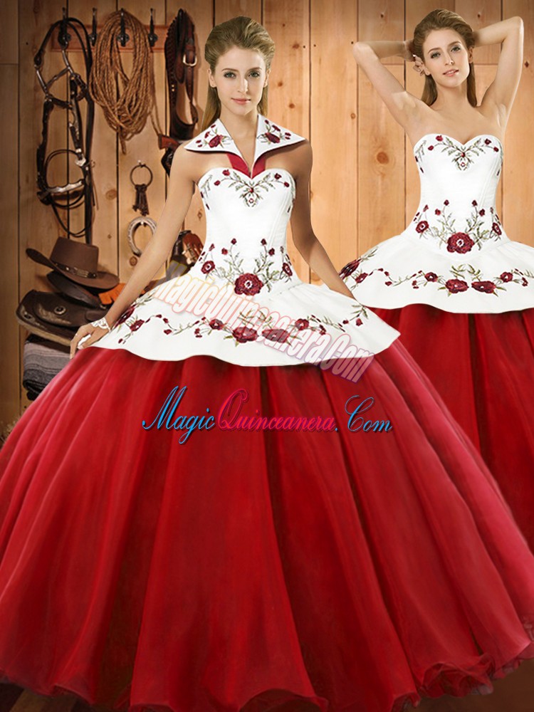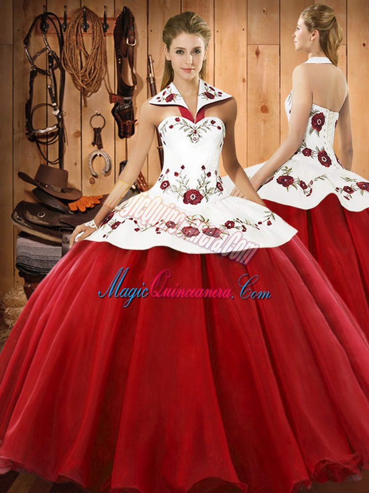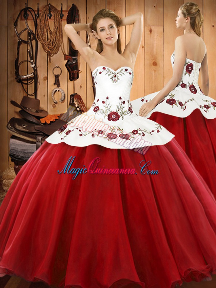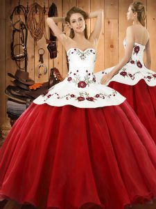 , Dramatic Wine Red Sleeveless Floor Length Embroidery Lace Up Vestidos de Quinceanera