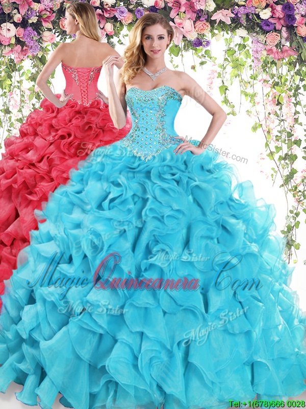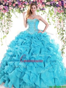Dynamic Baby Blue Organza Lace Up Sweetheart Sleeveless Quinceanera Gown Sweep Train Beading and Ruffles