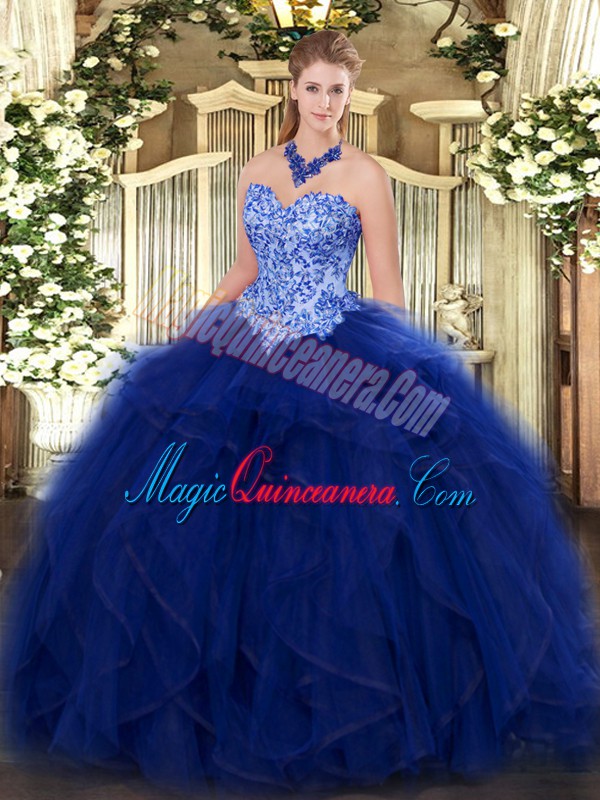 , Dynamic Blue Sleeveless Floor Length Appliques and Ruffles Lace Up Sweet 16 Dresses