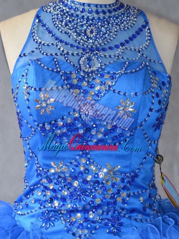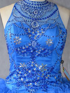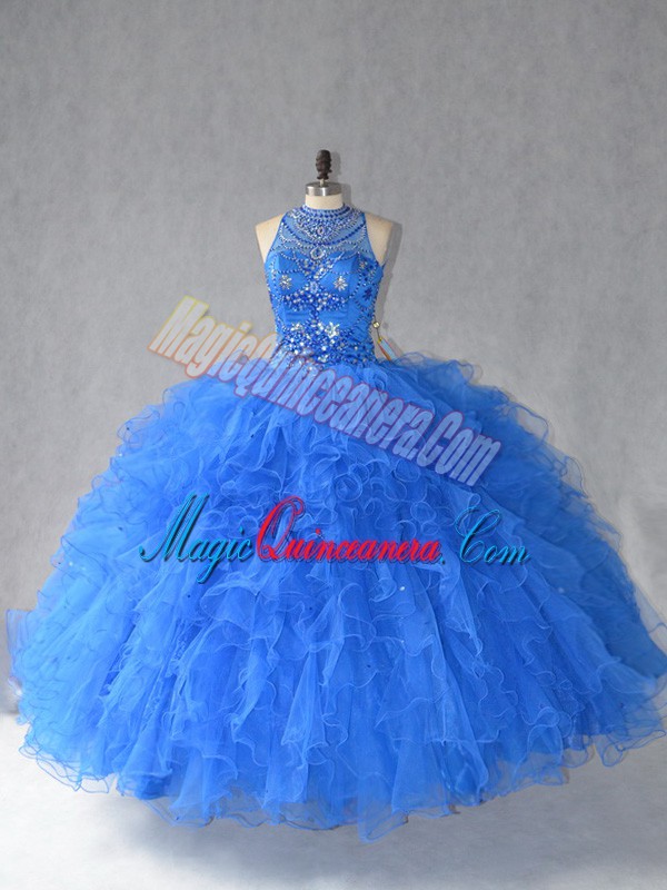 Dynamic Floor Length Royal Blue Quinceanera Dress Halter Top Sleeveless Lace Up