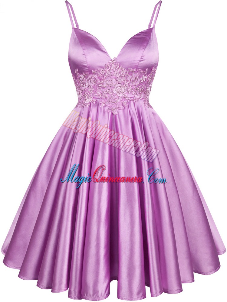 , Dynamic Knee Length Lilac Damas Dress Spaghetti Straps Sleeveless Lace Up