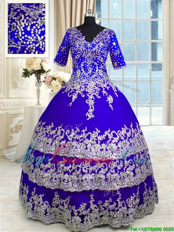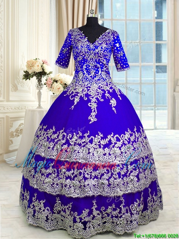 Dynamic Ruffled V-neck Half Sleeves Zipper Ball Gown Prom Dress Blue Satin and Tulle