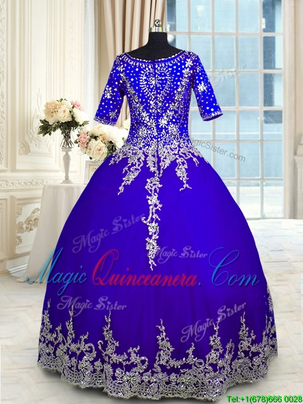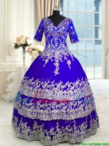 , Dynamic Ruffled V-neck Half Sleeves Zipper Ball Gown Prom Dress Blue Satin and Tulle