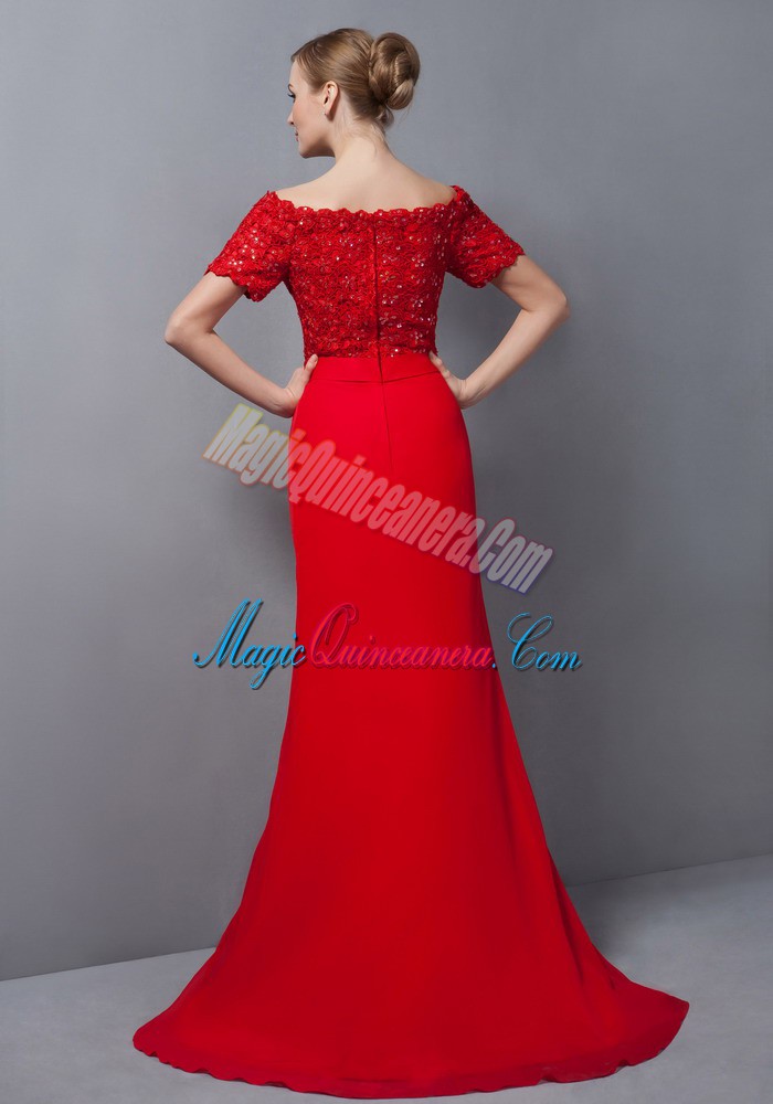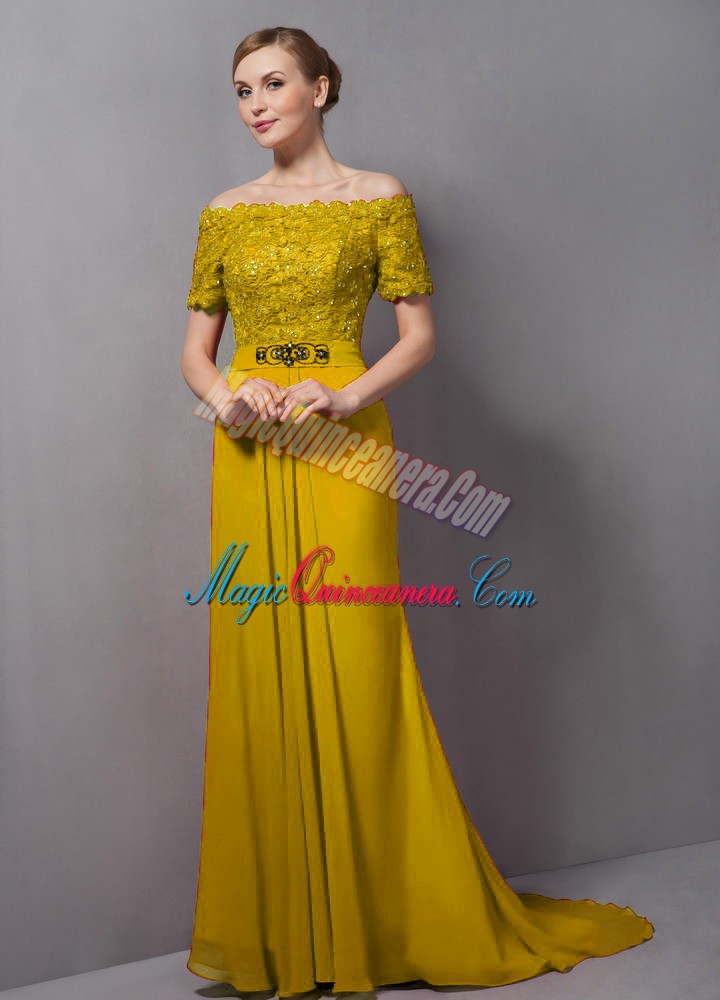 Dynamic Yellow Mother of Bride Dresses Prom and Party with Lace Off The Shoulder Short Sleeves Sweep Train Zipper