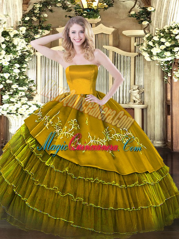 Edgy Brown Strapless Zipper Embroidery and Ruffled Layers Quinceanera Dress Sleeveless