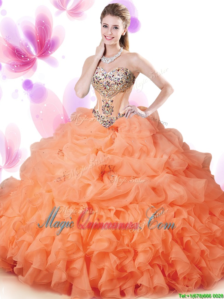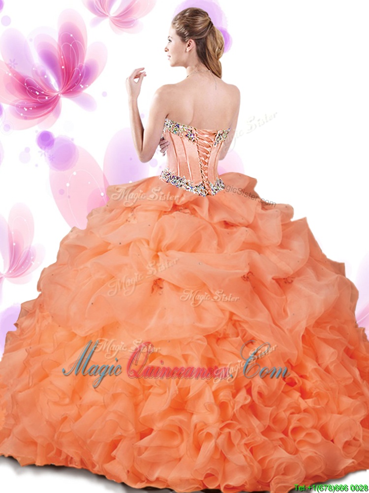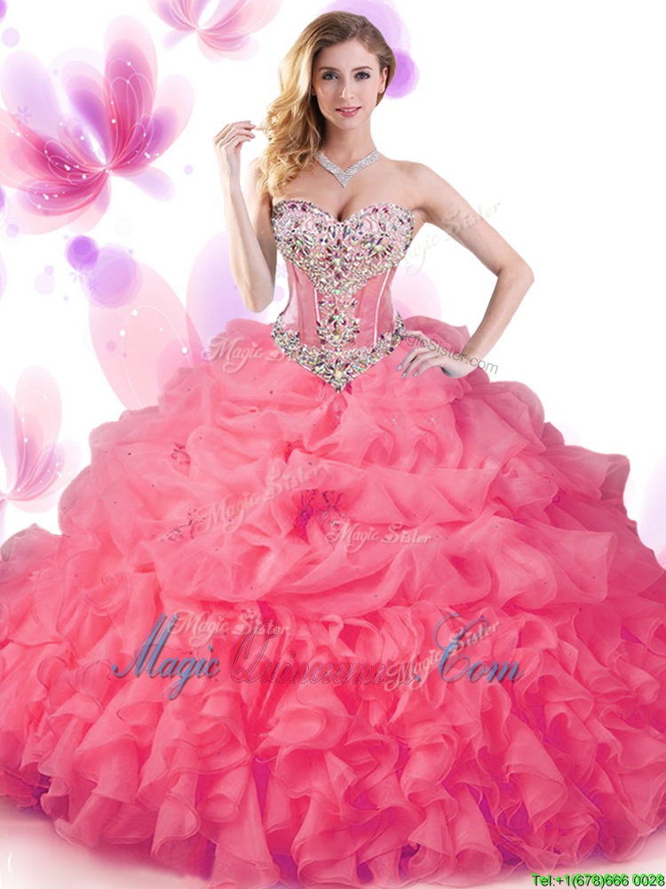 Edgy Hot Pink Sleeveless Floor Length Beading and Ruffles and Pick Ups Lace Up Sweet 16 Dresses