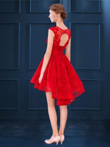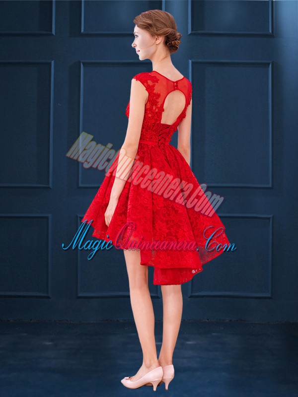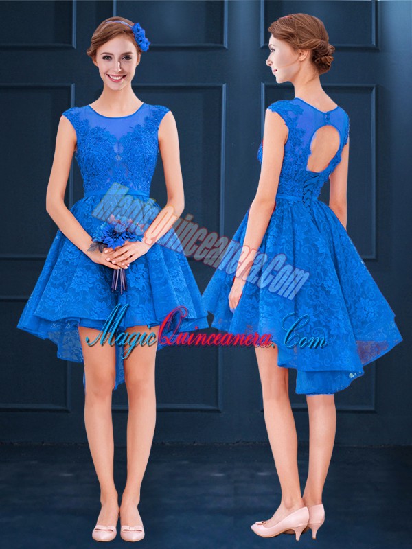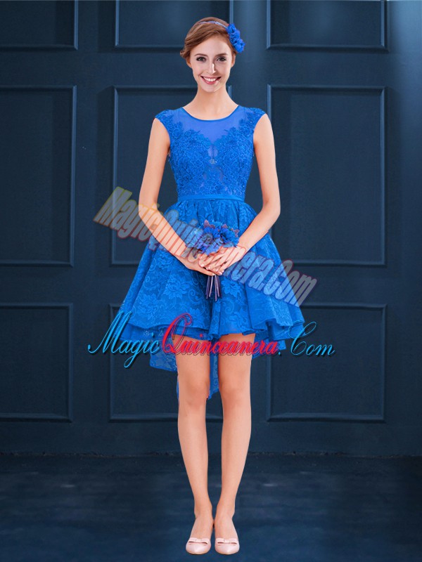 Edgy Satin and Lace Scoop Sleeveless Clasp Handle Lace and Belt Dama Dress for Quinceanera in Blue