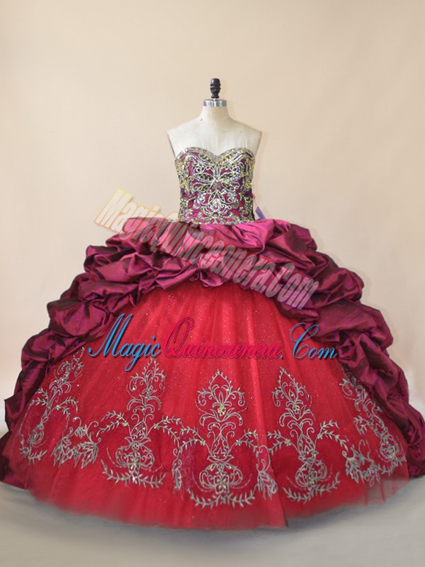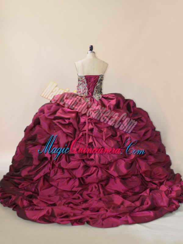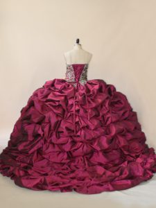 Edgy Sleeveless Taffeta and Tulle Brush Train Lace Up 15 Quinceanera Dress in Fuchsia with Beading and Pick Ups