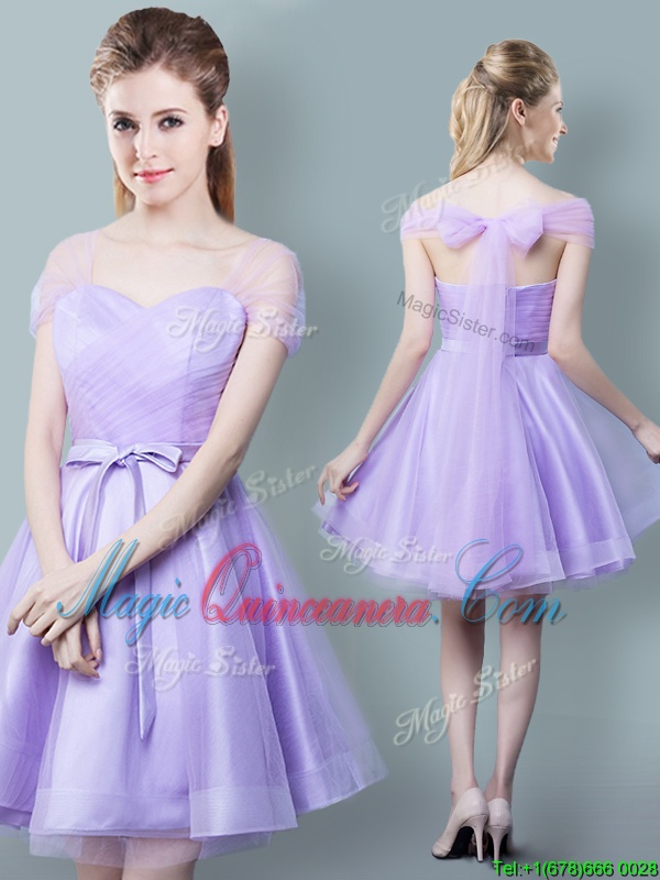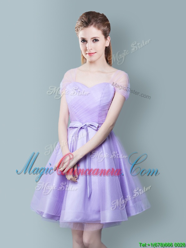 Edgy Straps Straps Cap Sleeves Knee Length Ruching and Bowknot Zipper Damas Dress with Lavender