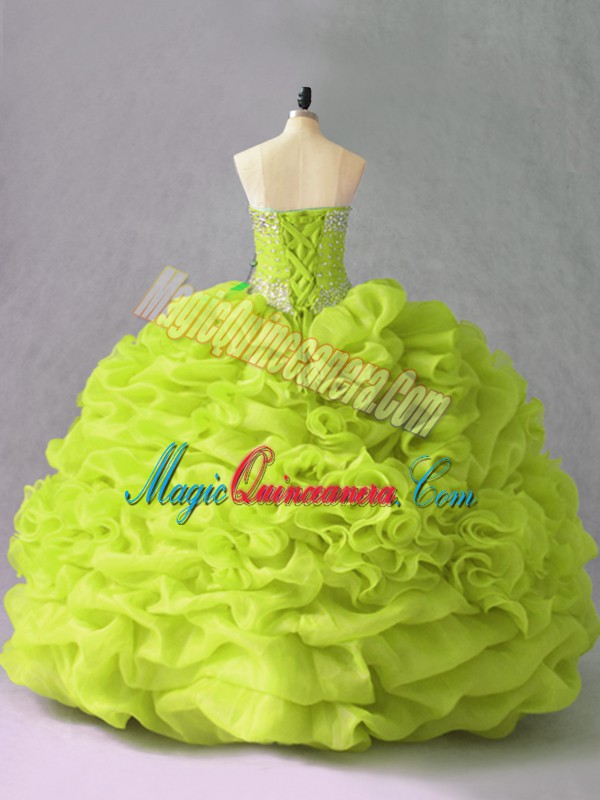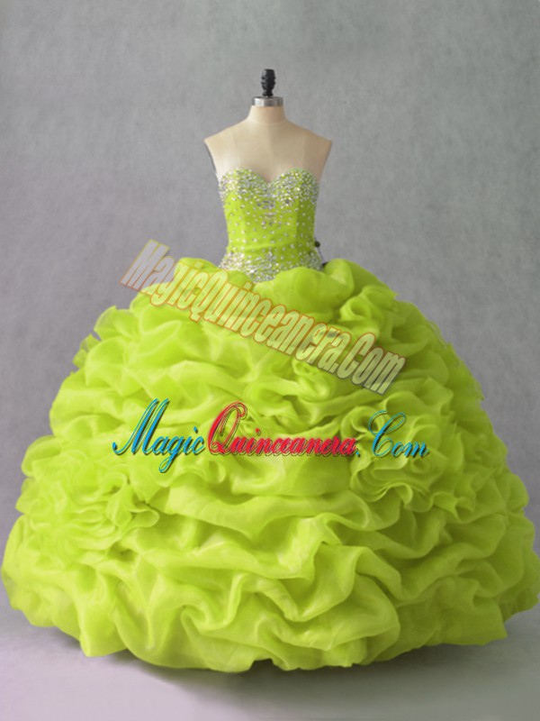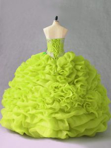 Edgy Yellow Green Ball Gowns Beading and Pick Ups and Hand Made Flower 15 Quinceanera Dress Lace Up Organza Sleeveless Floor Length