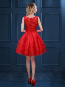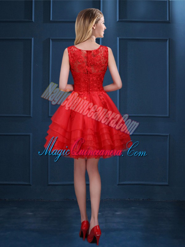 Eggplant Purple A-line Tulle Scoop Sleeveless Lace and Ruffled Layers Knee Length Zipper Dama Dress for Quinceanera