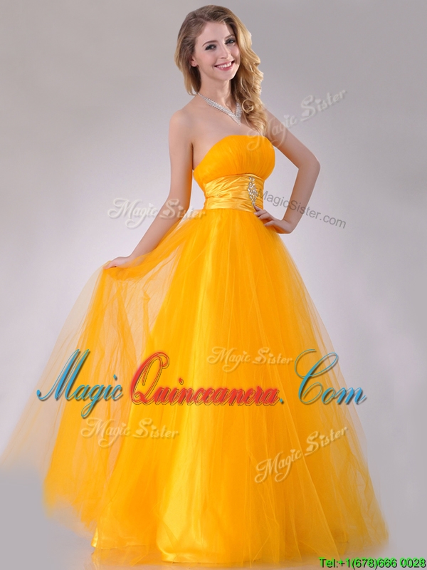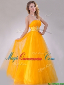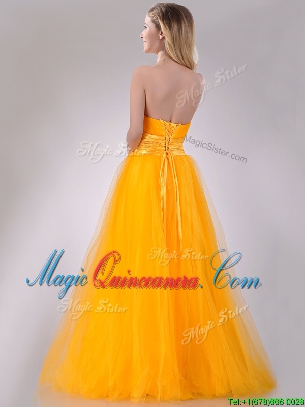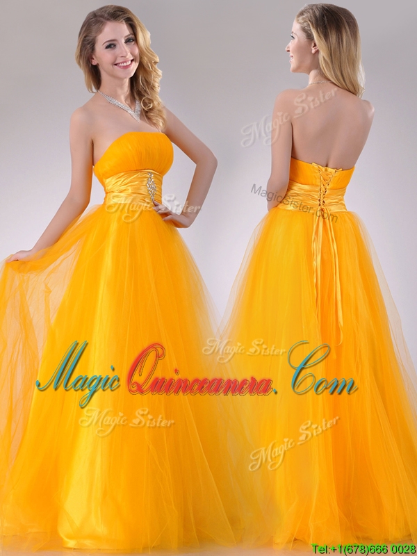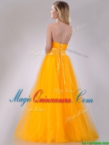 Elegant A Line Beaded Tulle Gold Dama Dress with Lace Up