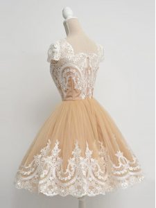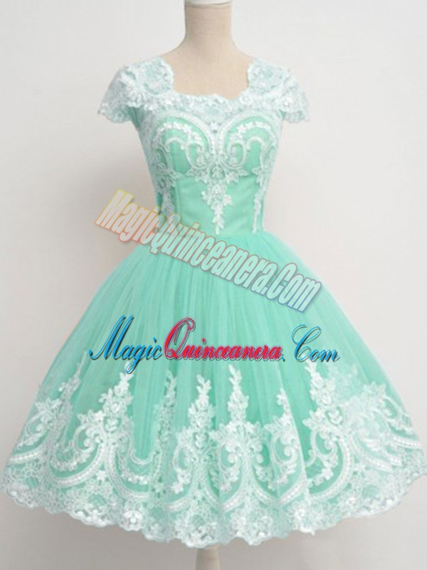 Elegant Apple Green Tulle Zipper Square Cap Sleeves Knee Length Quinceanera Court Dresses Lace