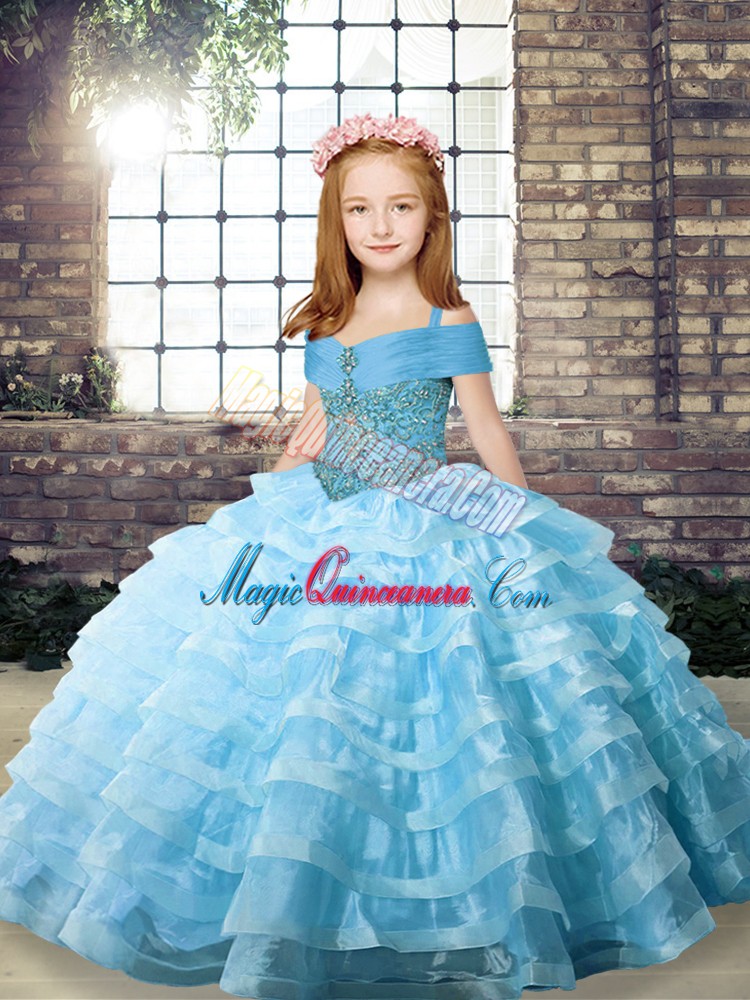 Elegant Aqua Blue Ball Gowns Organza Straps Sleeveless Beading and Ruffled Layers Lace Up Girls Pageant Dresses Brush Train