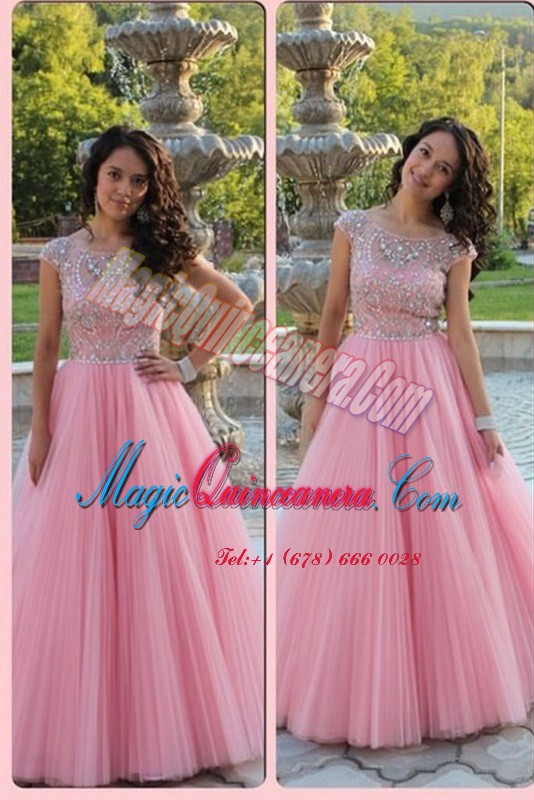, Elegant Baby Pink Scoop Zipper Beading Evening Dress Cap Sleeves