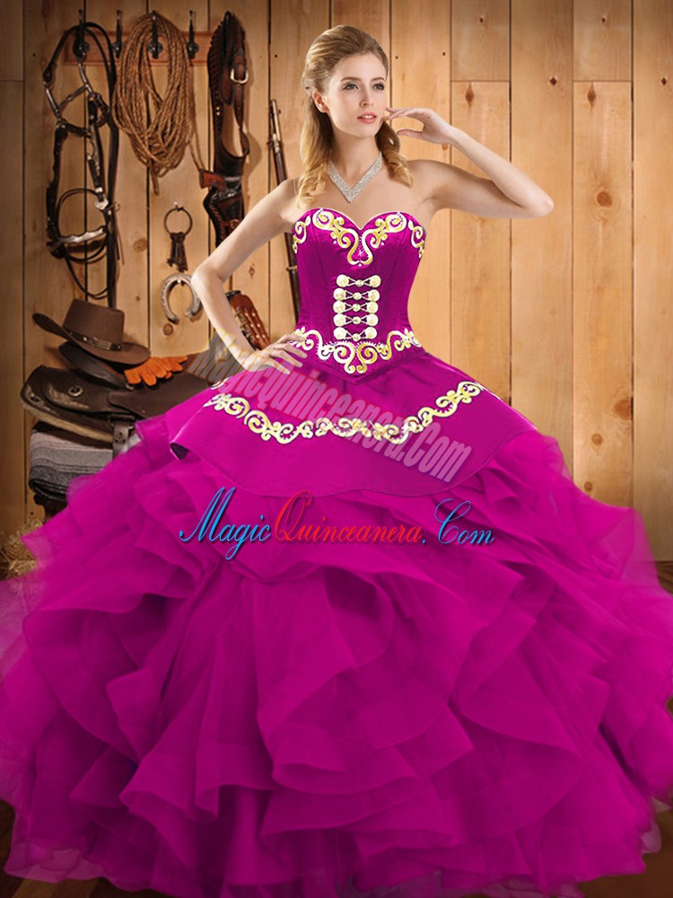 Elegant Fuchsia Sleeveless Satin and Organza Lace Up Vestidos de Quinceanera for Military Ball and Sweet 16 and Quinceanera