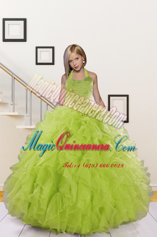 Elegant Halter Top Floor Length Lace Up Girls Pageant Dresses Olive Green for Party and Wedding Party with Beading and Ruffles