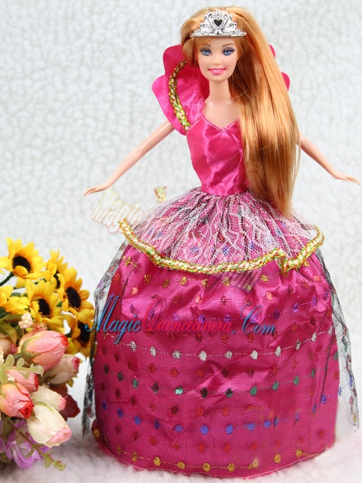 Elegant Hot Pink Taffeta Ball Gown Party Clothes Embroidery Dress For Nobel Barbie