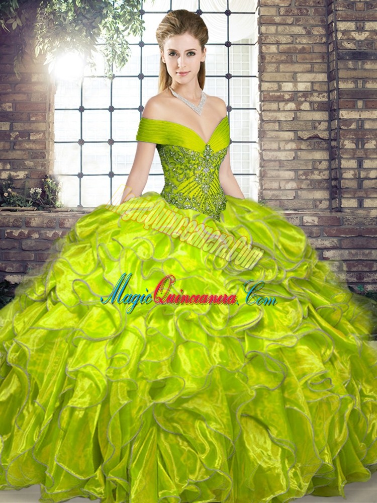 Elegant Off The Shoulder Sleeveless Quinceanera Gowns Floor Length Beading and Ruffles Olive Green Organza