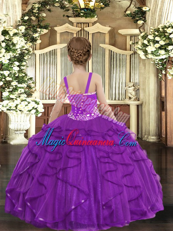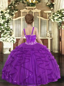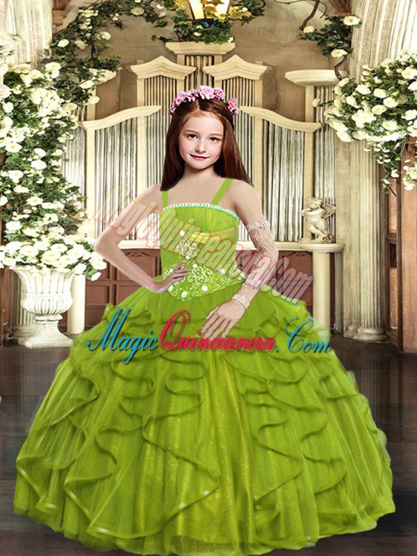 Elegant Olive Green Tulle Lace Up Kids Formal Wear Sleeveless Floor Length Beading and Ruffles