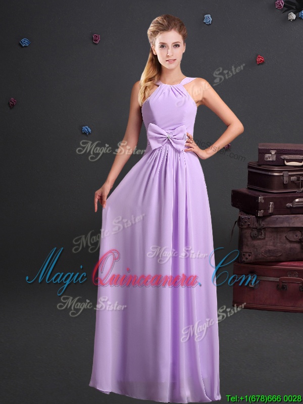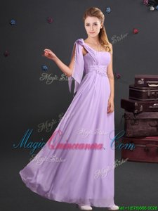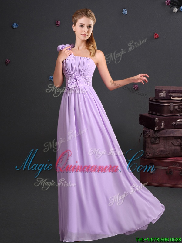 Elegant One Shoulder Chiffon Sleeveless Floor Length Quinceanera Court Dresses and Ruching and Bowknot and Hand Made Flower