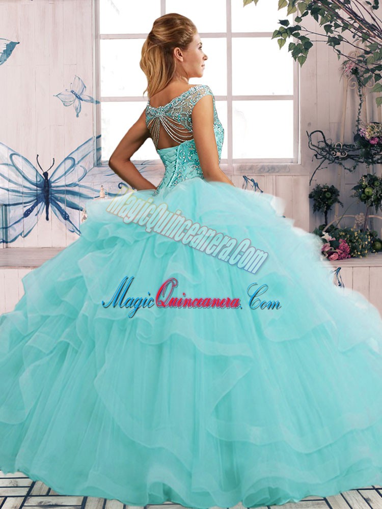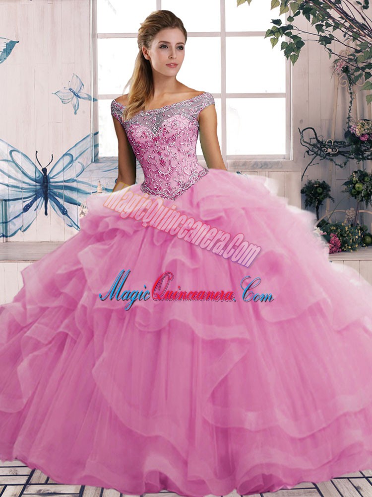 Elegant Rose Pink Tulle Lace Up Off The Shoulder Sleeveless Floor Length 15th Birthday Dress Beading and Ruffles