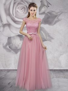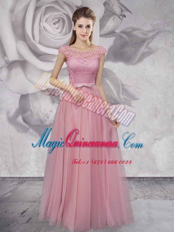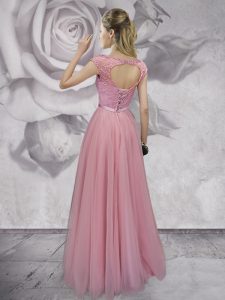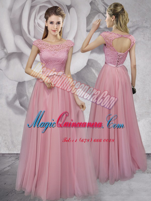 Elegant Scoop Cap Sleeves Lace Up Prom Party Dress Pink Tulle