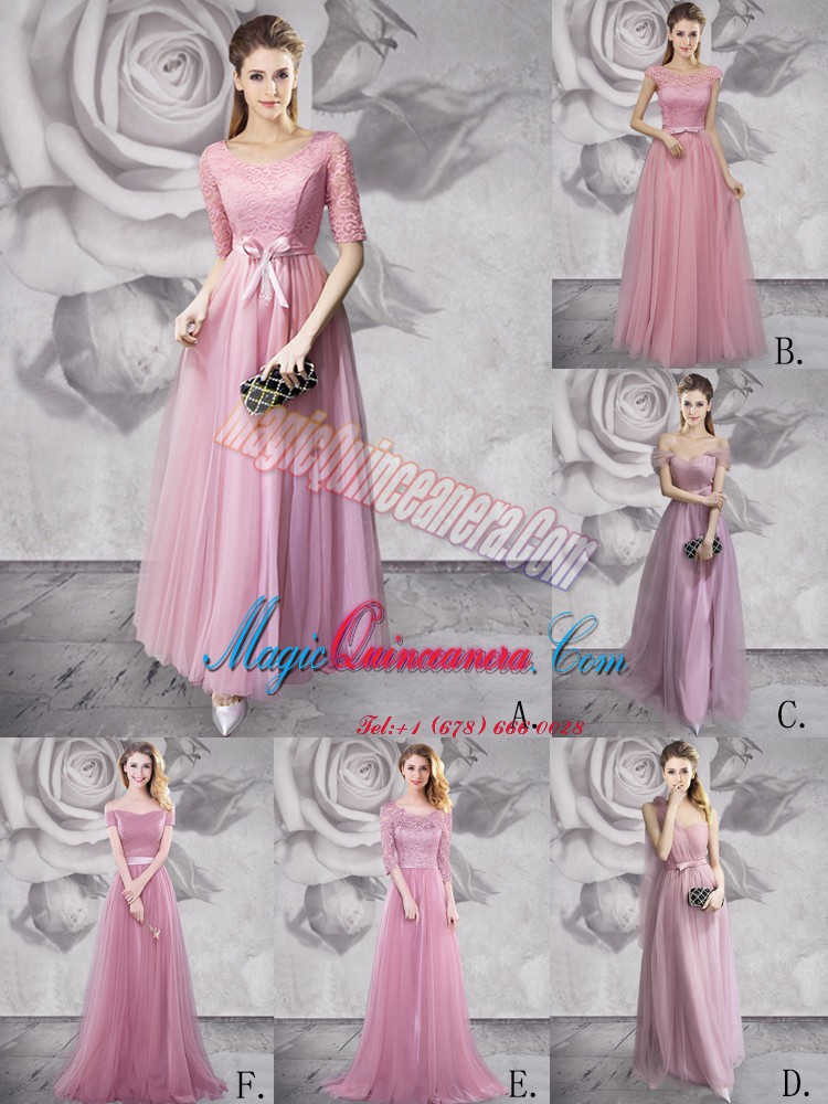 , Elegant Scoop Cap Sleeves Lace Up Prom Party Dress Pink Tulle