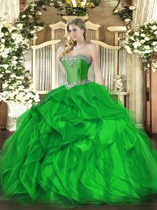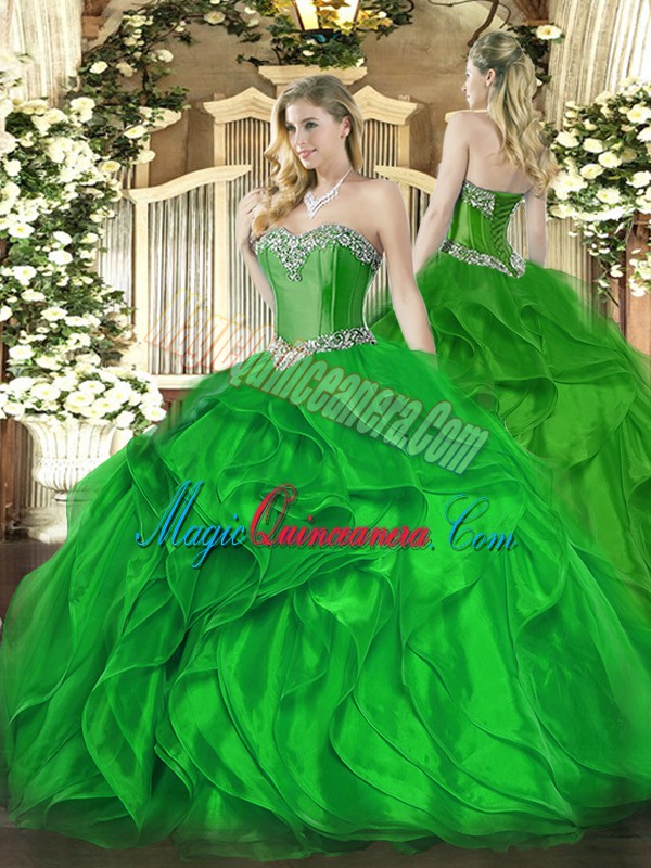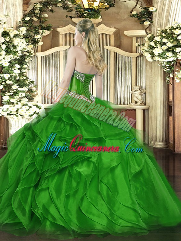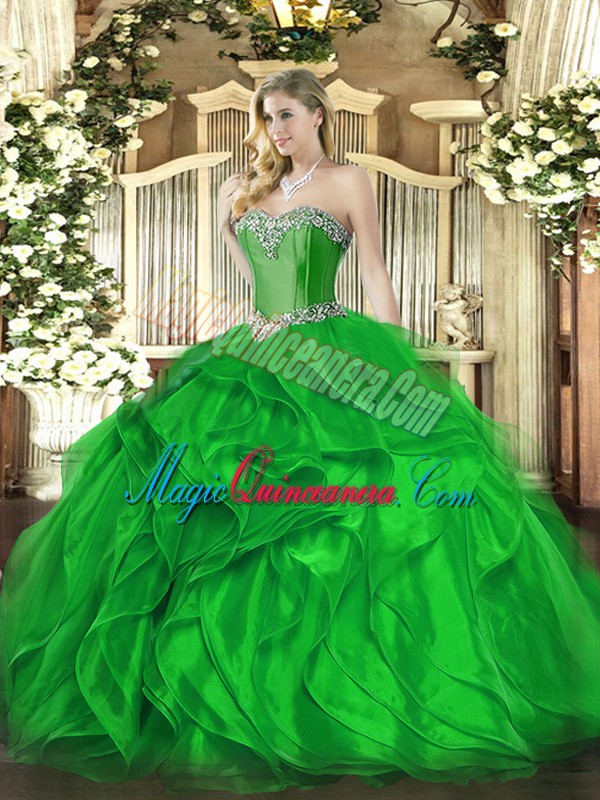 Elegant Sleeveless Organza Floor Length Lace Up 15th Birthday Dress in Green with Beading and Ruffles